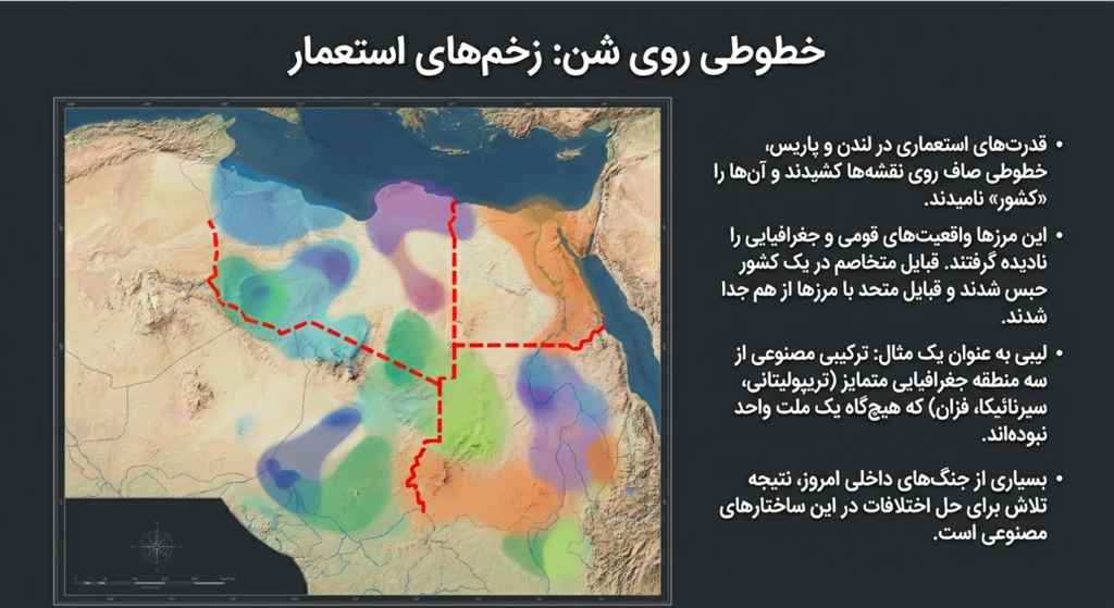 - زخمهای استعمار: مرزهای صافی که اروپاییها روی شنها کشیدند، بدون توجه به اقوام، ملتها را تکه پاره کرد (مثل لیبی).