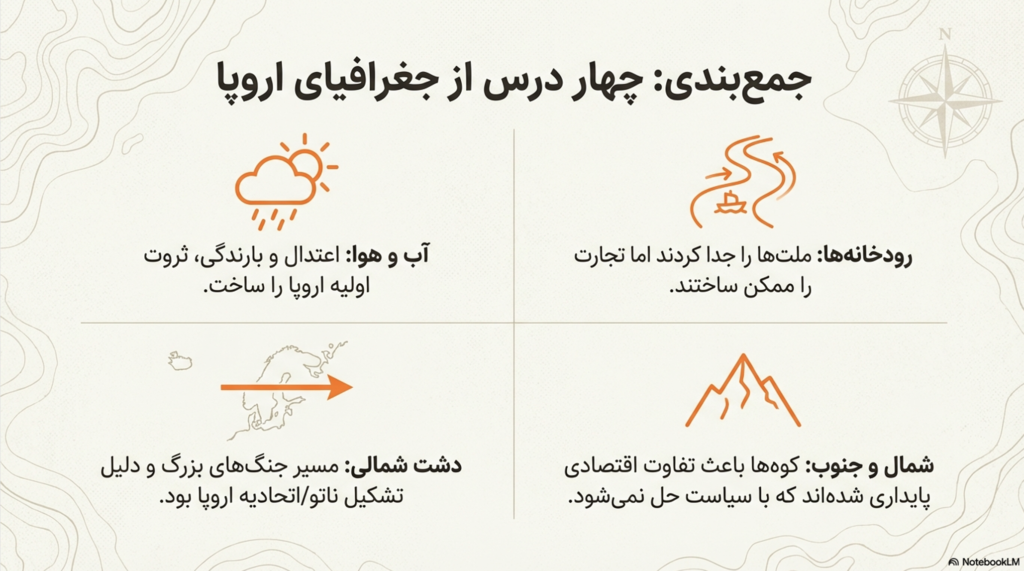 چرا شمال اروپا ثروتمند و جنوب آن کوهستانی و کم‌رونق است؟ فایل جدید ما با تحلیل جغرافیای اروپای غربی، پرده از راز توسعه‌یافتگی این منطقه برمی‌دارد. از تاثیر حیاتی رودخانه‌های راین و دانوب در تجارت گرفته تا نقش کوه‌های آلپ و پیرنه در مرزبندی ملت‌ها؛ دریابید که چگونه طبیعت، زیربنای سیاست و اقتصاد مدرن اروپا را شکل داده است.