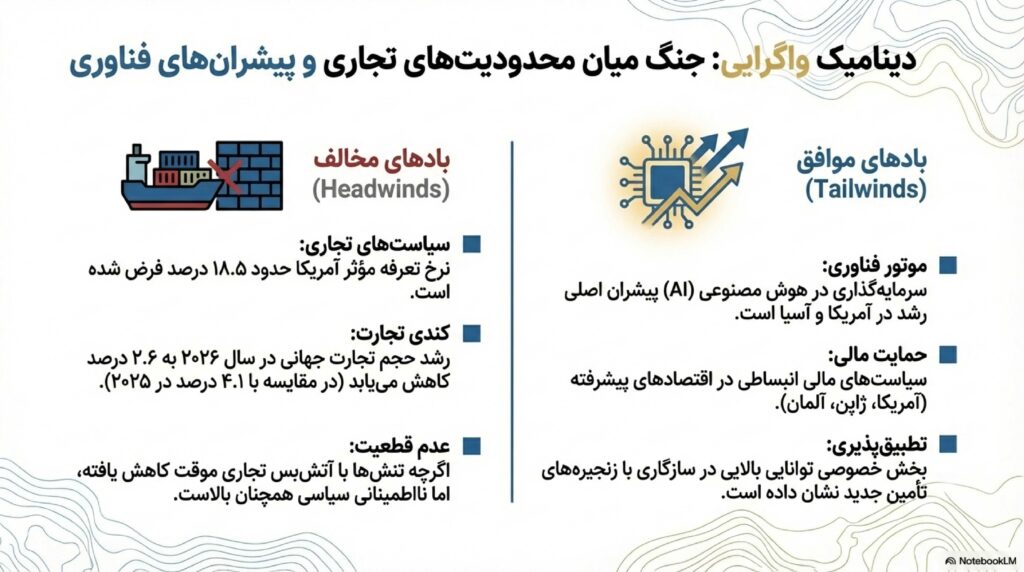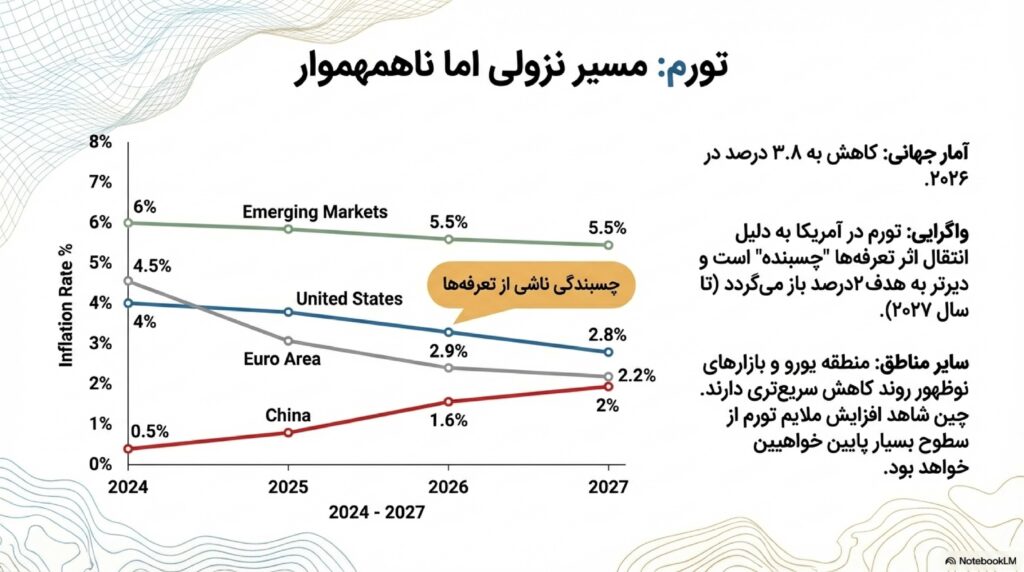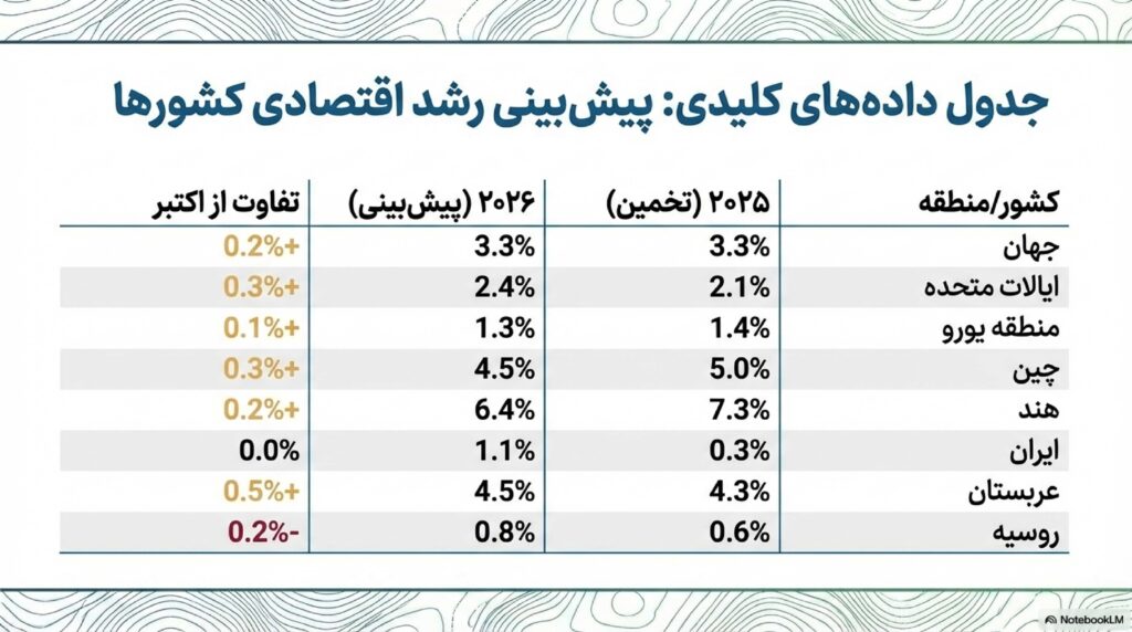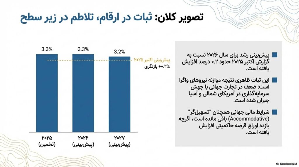خلاصه ماجرا این است: تورم جهانی رو به کاهش است (۳.۸٪) و رشد اقتصادی روی ۳.۳٪ ثابت مانده. اما این آرامش ظاهری، حاصل خنثی شدن دو نیروی عظیم است: